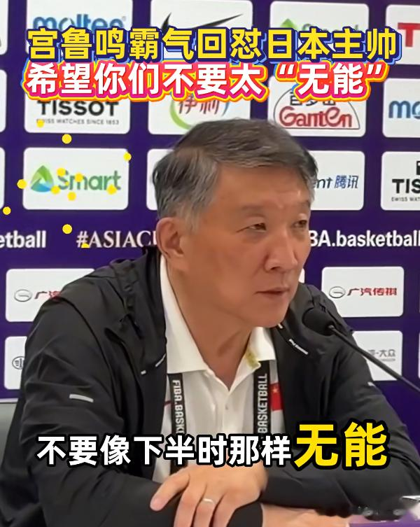 宫鲁鸣在回应日本队主教练时,霸气表示:“我想最终决定比赛胜负的还是实力,希望日本队在接下来的比赛中,能拿出打澳大利亚队上半场的干劲来,不要像下半场那样无能。”